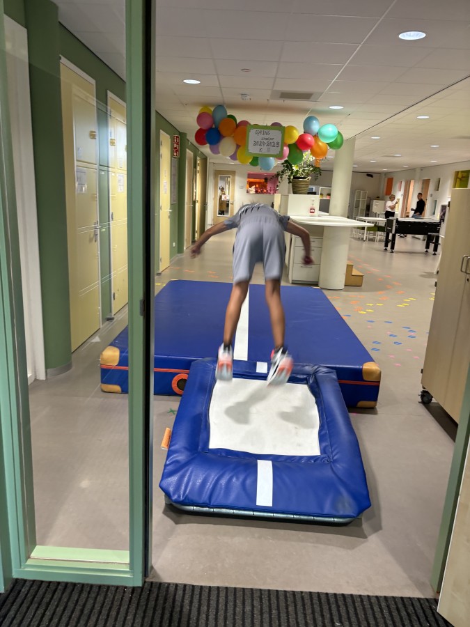 Nadat ze de spullen in hun kluisje hadden gedaan, sprongen ze letterlijk met behulp van de trampoline (wat inmiddels een traditie begint te worden) de school binnen!